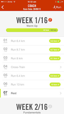 So I pulled up my phone, launched Nike Running, navigated to Coach, keyed in race date as 20th Sep 2015 – and it created a training plan starting from June 1st ( 16 weeks total)